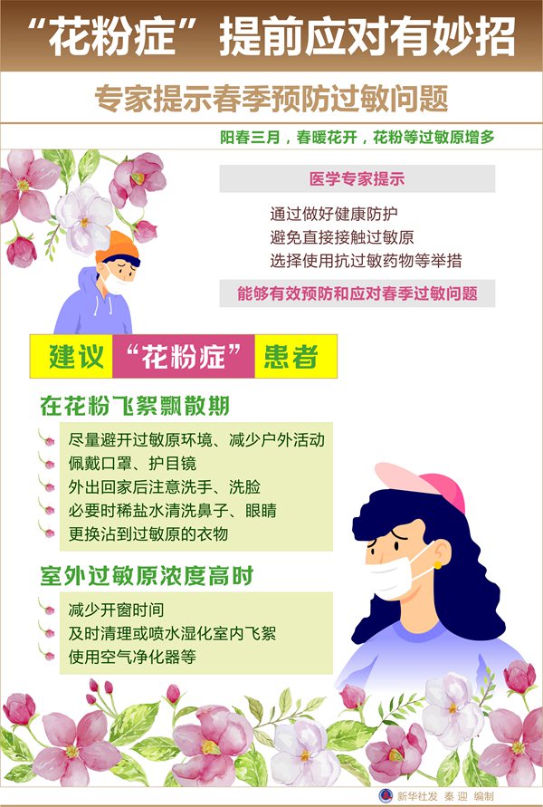 陽春三月,春暖花開。隨著春季到來,花粉等過敏原增多,可能給過敏性體質人群的出行和生活帶來不便。醫學專家提示,通過做好健康防護,避免直接接觸過敏原,選擇使用抗過敏藥物等舉措,能夠有效預防和應對春季過敏問題。