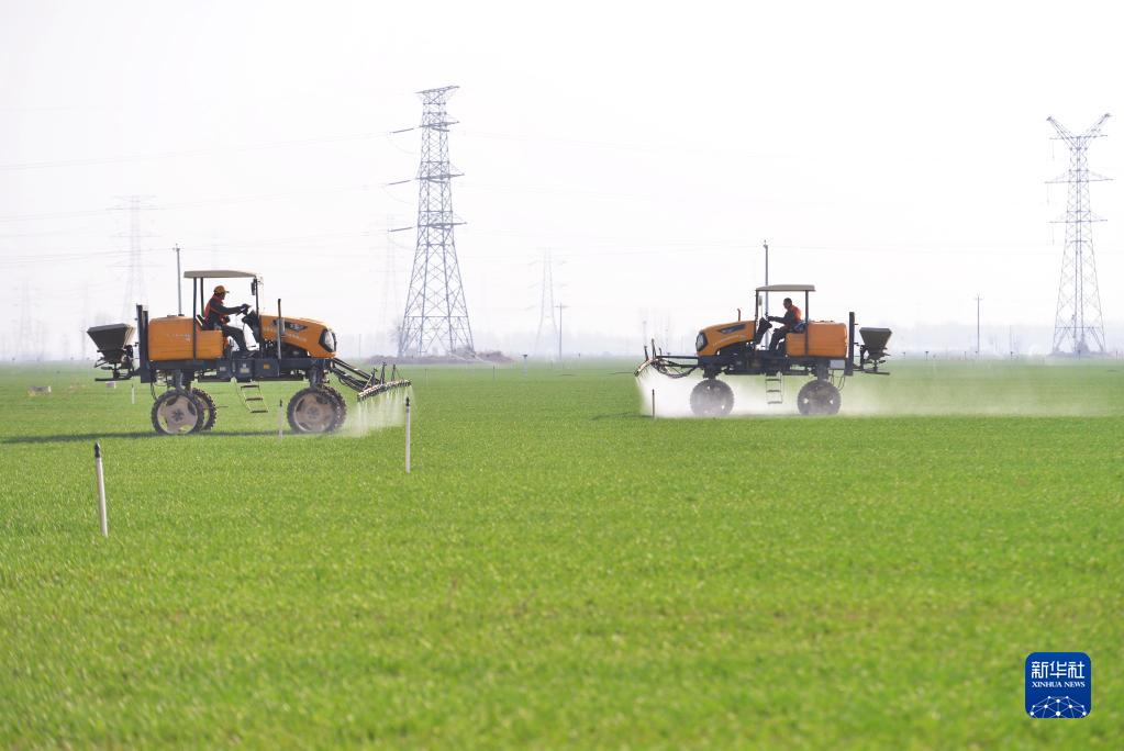 河北省晉州市槐樹鎮(zhèn)北白水村一家農業(yè)合作社的社員操作農業(yè)機械給冬小麥噴灑農藥(2023年3月14日攝)。新華社記者 楊世堯 攝