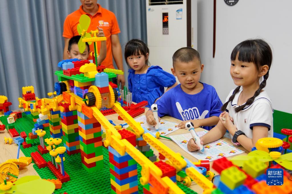 在重慶豐都縣高家鎮(zhèn)汶溪社區(qū)黨群服務中心內,幾名加入家庭教育互助會的孩子在體驗兒童機器人課程(2022年8月24日攝)。豐都縣的鄉(xiāng)村、社區(qū)家庭教育互助會致力于服務豐都外出務工家庭及留守兒童。新華社記者 劉潺 攝