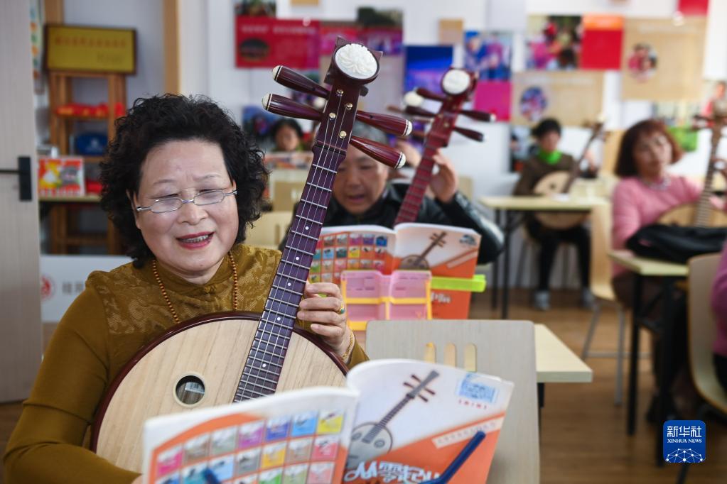 在浙江省嘉興市南湖區(qū)桂苑社區(qū)的老年大學活動室內,老人們在老師的指導下學琴(2023年3月7日攝)。新華社記者 徐昱 攝
