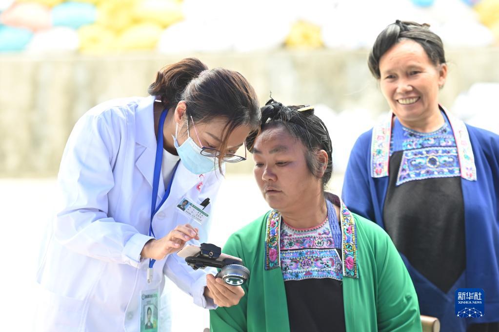 在廣西融水苗族自治縣白云鄉(xiāng)幫陽村,來自廣東醫(yī)科大學附屬醫(yī)院的李芳谷博士(左)在“送醫(yī)進苗寨”活動上給村民提供醫(yī)療服務(2022年10月26日攝)。新華社記者 黃孝邦 攝