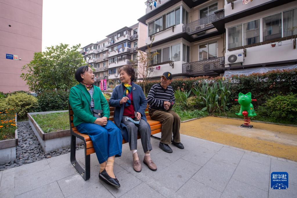 浙江省杭州市西湖區(qū)北山街道松木場社區(qū)的居民在老舊小區(qū)改造后建成的休閑場地聊家常(2022年11月1日攝)。新華社記者 江漢 攝