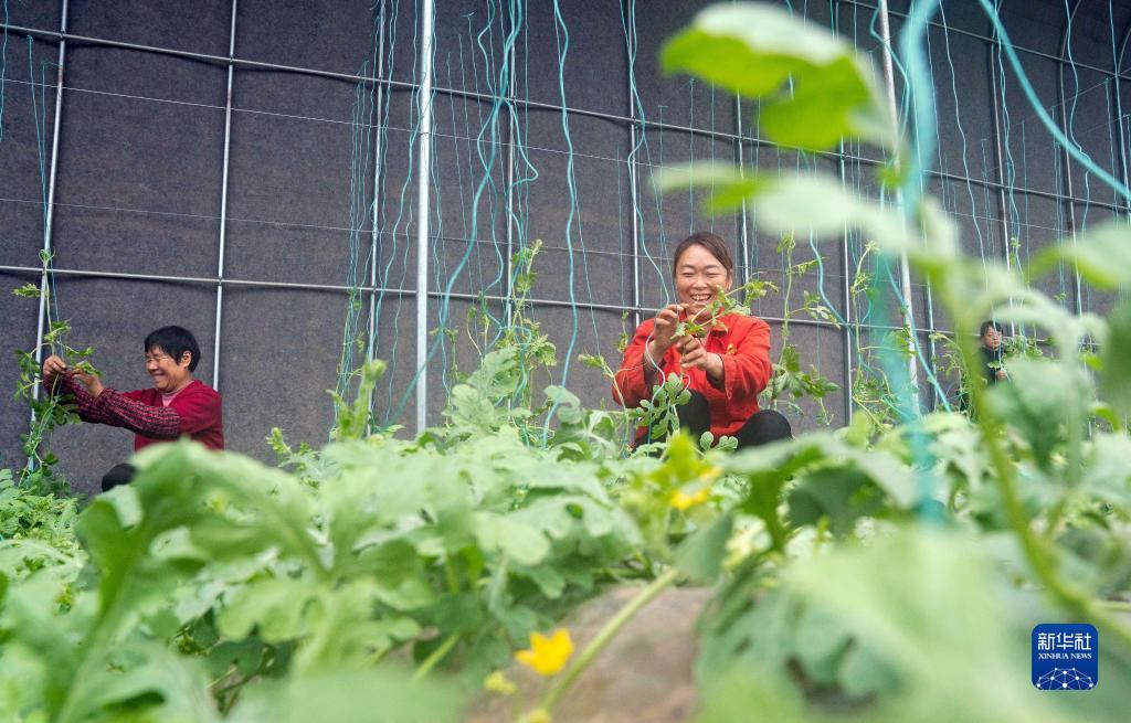農戶在河北滄州渤海新區(qū)黃驊市一處農業(yè)科技示范園為西瓜秧整枝(2023年2月11日攝)。新華社記者 駱學峰 攝