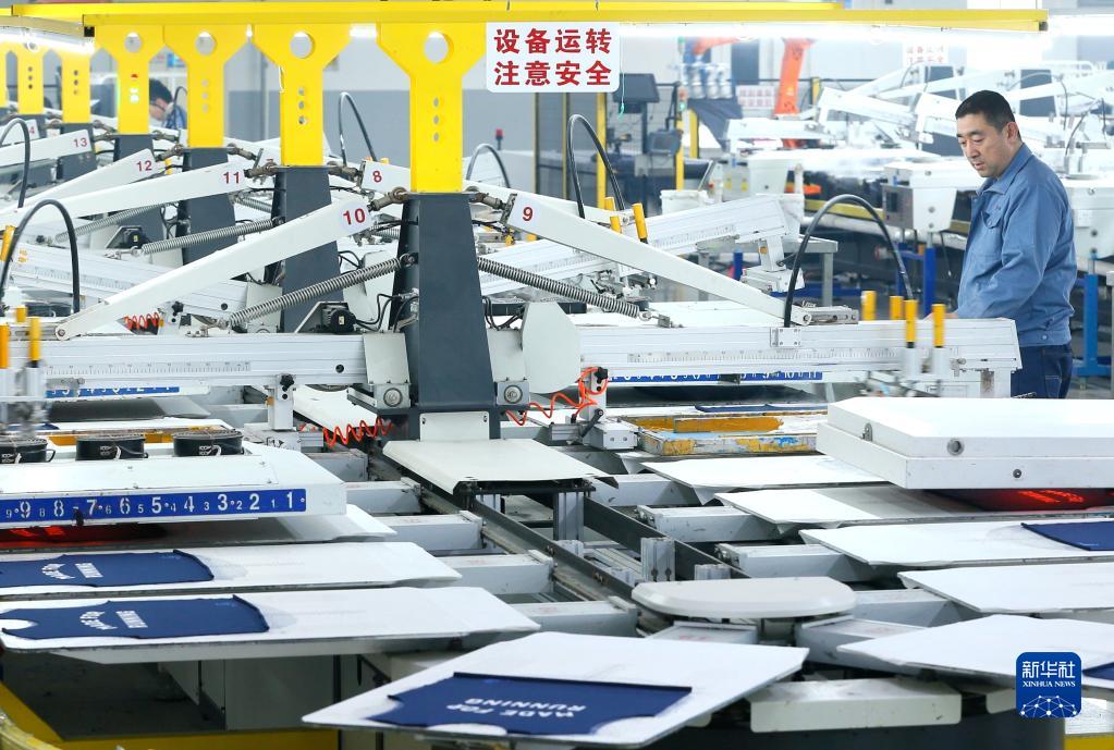 山東省青島市即墨區(qū)青島華信印花有限公司的工人在智能印花生產(chǎn)線上生產(chǎn)出口產(chǎn)品(2023年3月14日攝)。新華社發(fā)(梁孝鵬 攝)