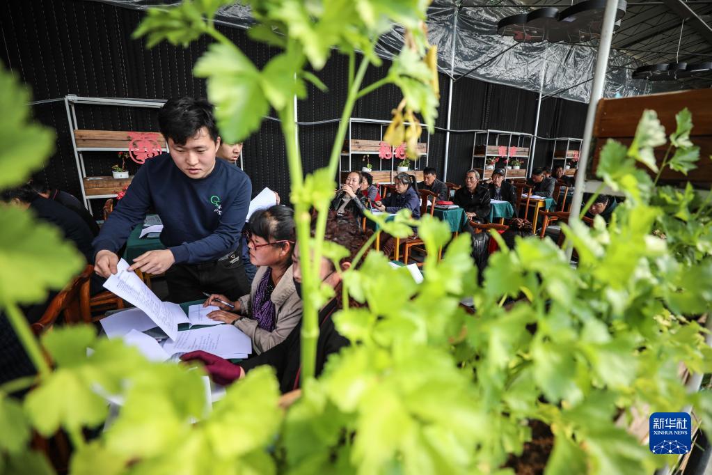 在遼寧省盤錦市大洼區(qū)田家街道大堡子村,回鄉(xiāng)創(chuàng)業(yè)大學(xué)生郭佳明(前左)在培訓(xùn)課上回答農(nóng)民提出的問題(2019年4月15日攝)。新華社記者 潘昱龍 攝