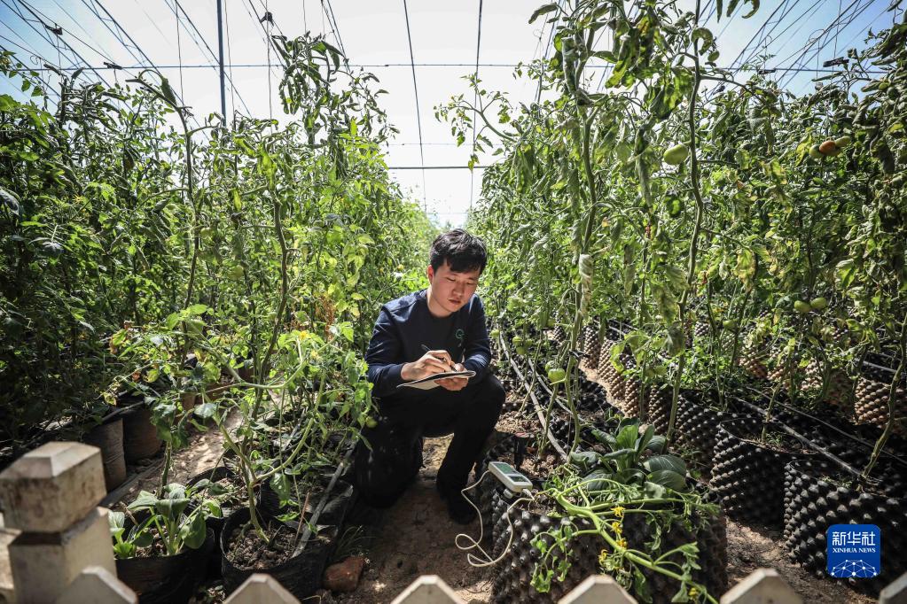 在遼寧省盤錦市大洼區(qū)田家街道大堡子村,回鄉(xiāng)創(chuàng)業(yè)大學(xué)生郭佳明在溫室大棚內(nèi)查看堿地西紅柿的生長情況(2019年4月15日攝)。新華社記者 潘昱龍 攝