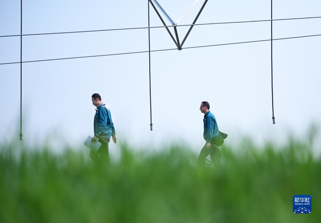 在河南省駐馬店市西平縣老王坡高標(biāo)準(zhǔn)農(nóng)田示范區(qū),劉亞輝(右)和王英凡在對平移式水肥一體化噴灌機(jī)進(jìn)行巡檢(2023年2月28日攝)。新華社記者 張浩然 攝