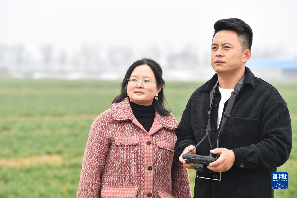 在陜西省寶雞市陳倉區(qū)慕儀鎮(zhèn)齊西村的農(nóng)田,齊葉葉與齊昆(右)操控植保無人機(jī)管護(hù)作物(2023年2月27日攝)。新華社記者 張博文 攝