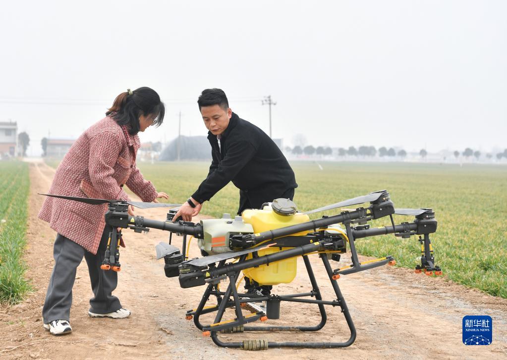 在陜西省寶雞市陳倉區(qū)慕儀鎮(zhèn)齊西村的農(nóng)田,齊葉葉(左)與齊昆調(diào)試植保無人機(jī)(2023年2月27日攝)。新華社記者 張博文 攝