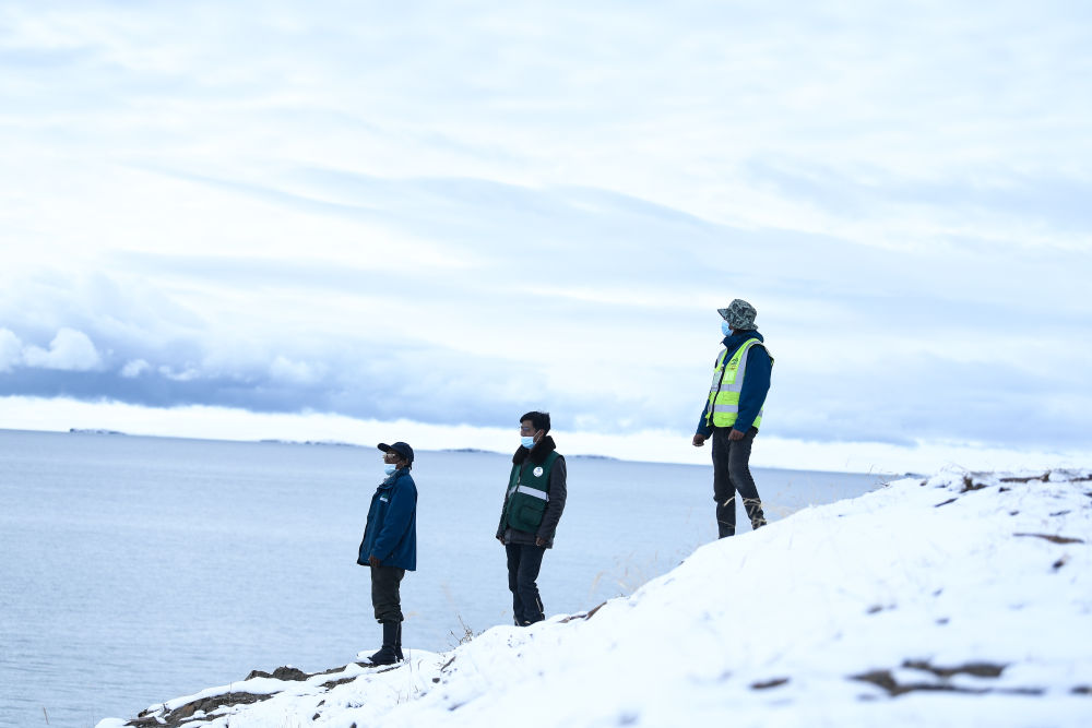 2021年10月20日,在青海省果洛藏族自治州瑪多縣扎陵湖鄉(xiāng)勒那村,三江源國(guó)家公園黃河源園區(qū)生態(tài)管護(hù)員在扎陵湖畔巡護(hù)。新華社記者 李占軼 攝