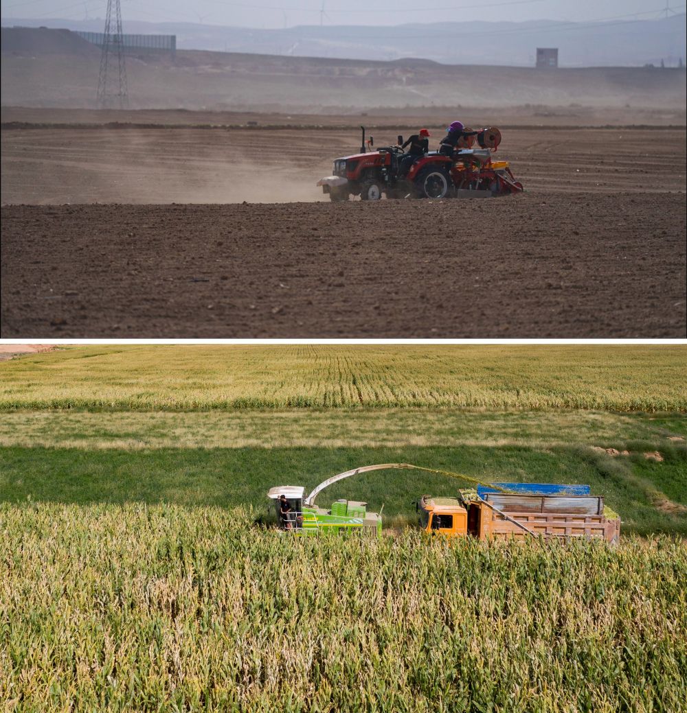 這是一張拼版照片:上圖是農(nóng)民在寧夏吳忠市同心縣韋州鎮(zhèn)鋪設(shè)滴灌帶(資料圖片);下圖是寧夏吳忠市同心縣韋州鎮(zhèn)現(xiàn)代高效節(jié)水灌溉項(xiàng)目建成后的高標(biāo)準(zhǔn)農(nóng)田,收割機(jī)在收割玉米(2023年9月14日攝)。新華社記者 楊植森 攝
