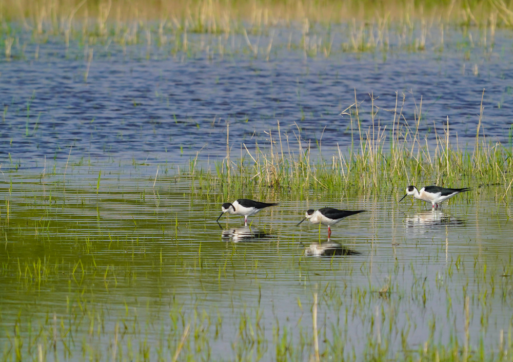 這是2023年3月30日拍攝的幾只水鳥(niǎo)在山東省高青縣蓑衣樊村附近的濕地覓食。新華社記者 邵琨 攝