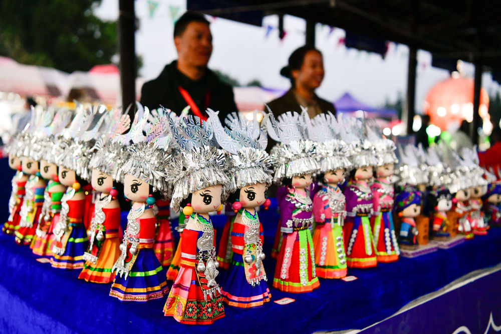 當地群眾在臺盤鄉球場旁搭建的非遺集市上銷售文創產品(2023年10月27日攝)。新華社記者 楊文斌 攝