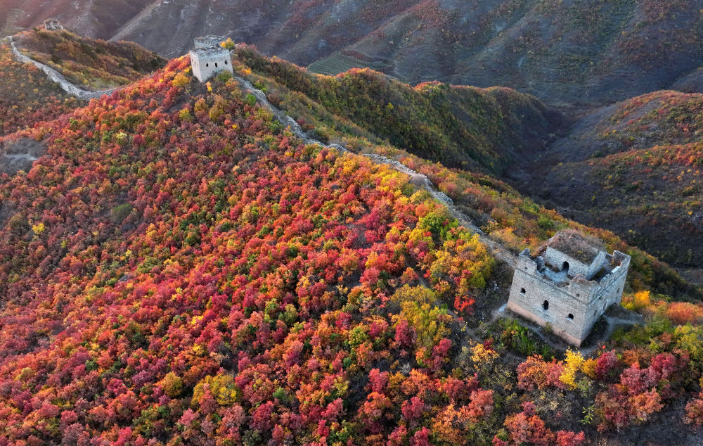 這是2023年10月26日在河北省秦皇島市海港區(qū)境內拍攝的城子峪長城景色(無人機照片)。新華社記者 楊世堯 攝