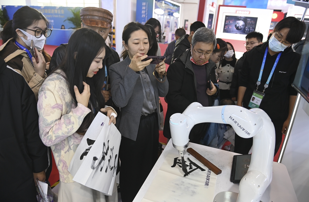 參觀者在首屆中國國際供應鏈促進博覽會數字科技鏈展區科大訊飛展位觀看一款AI書法機器人寫毛筆字(2023年12月2日攝)。新華社記者 蔡湘鑫 攝