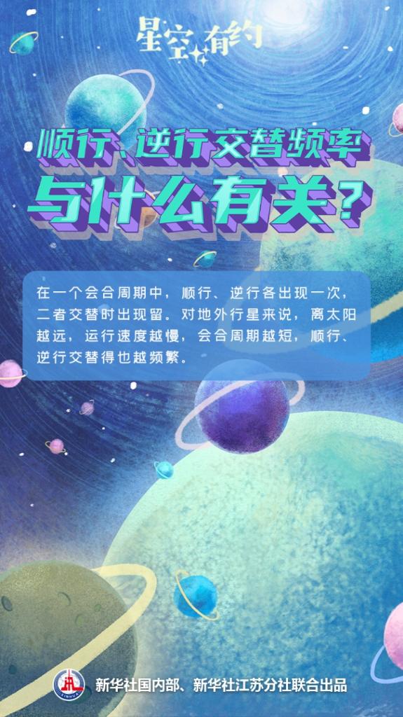 行星順行、逆行的發生頻率,取決于它們和地球的會合周期。“通俗地講,地球和地外行星都在圍繞太陽‘跑圈’。地球比地外行星多‘跑’一圈,再次‘追上’地外行星的時間就是會合周期。‘跑’得越慢的行星,地球越容易‘追’上,會合周期越短。”王科超說。