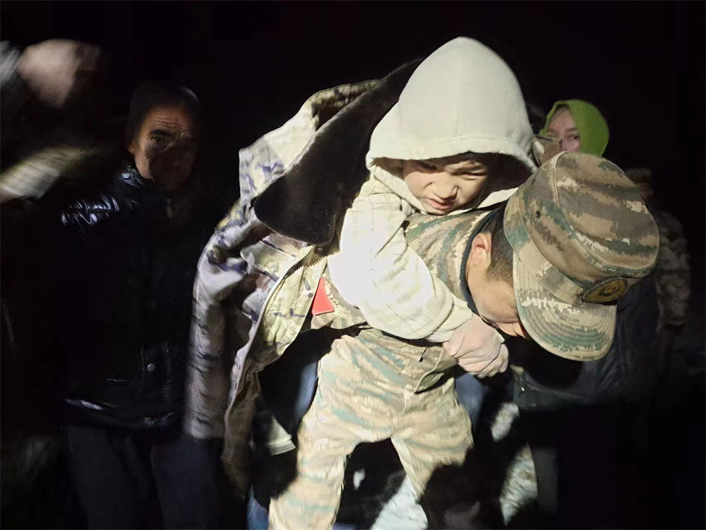 12月19日,武警甘肅總隊(duì)臨夏支隊(duì)官兵在甘肅省臨夏回族自治州積石山縣劉集鄉(xiāng)陽屲村展開救援。新華社發(fā)(侯崇慧 攝)