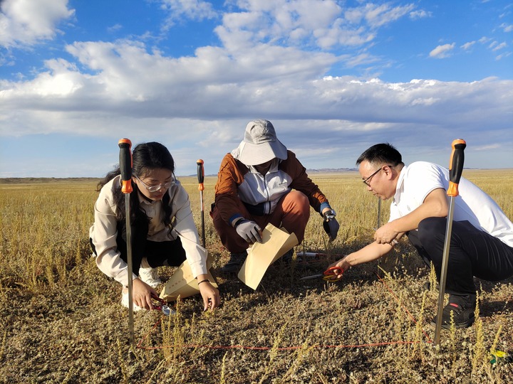 2024年生态质量地面监测中,薄文真(左一)和同事正在采集植物样本。(受访者供图)