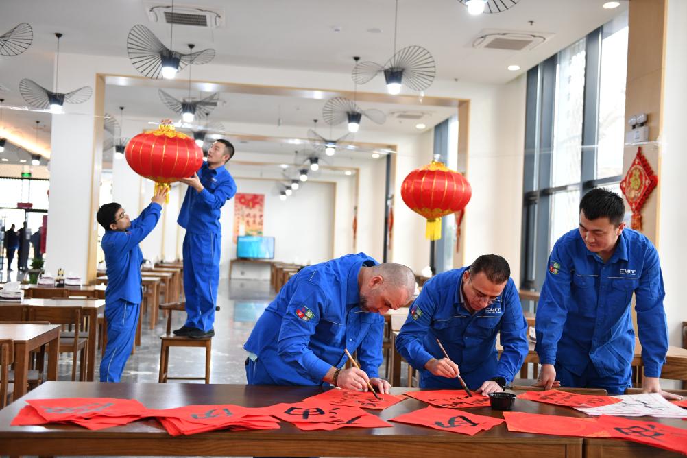1月23日,在伊拉克米桑油田,中海石油伊拉克有限公司中外员工一起写春联,挂灯笼。新华社发