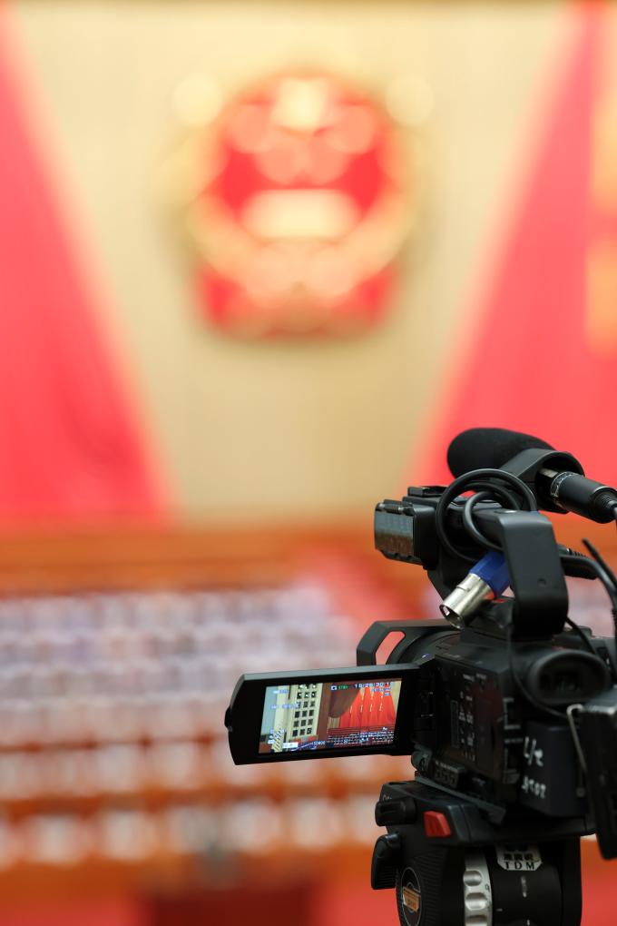 3月8日,十四届全国人大三次会议在北京人民大会堂举行第二次全体会议。这是记者在会场采访。