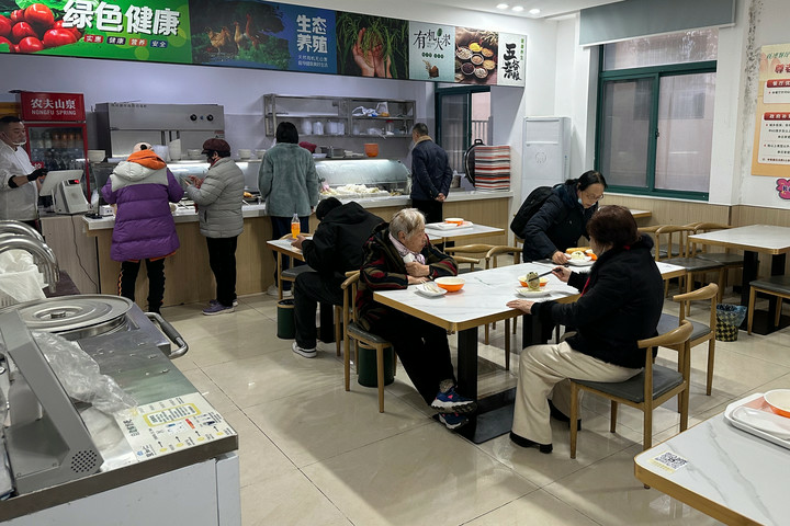 2025年3月8日,在江苏省连云港市海州区新东街道双园社区百穗餐厅,老人们正在享用晚餐。(庄婷婷 摄)