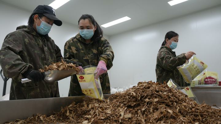 在河北省秦皇岛市青龙满族自治县,药企工人在打包中药材。(傅自胜 摄)