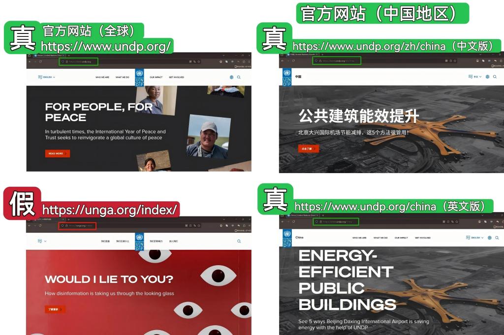 “四川中青人才科技研究院”伪造网站与UNDP官方网站的对比图。图片来源:联合国微信公众号