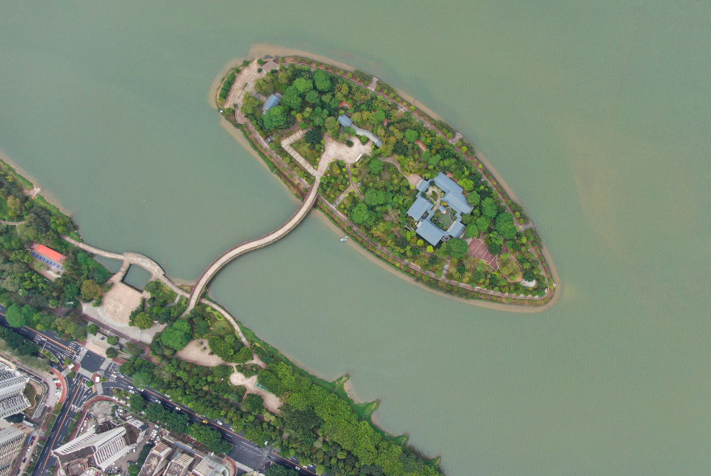 2021年4月8日拍摄的江心岛书院所在的广东清远清城区北江的江心岛(无人机照片)。新华社记者 邓华 摄