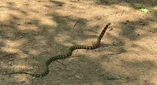 刚进入红石砬子抗日根据地遗址,记者就被这条毒蛇“野鸡脖子”尾随。采访过程中,还有蛇爬上了摄像机的三脚架。新华网 赵石乐 摄
