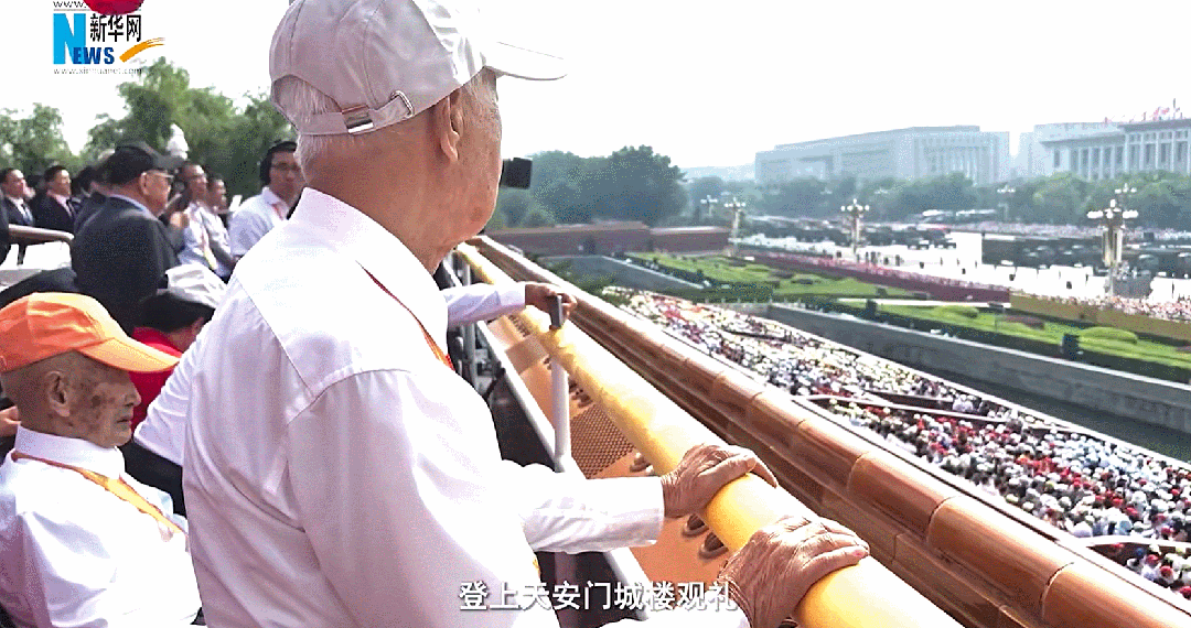 在纪念中国人民抗日战争暨世界反法西斯战争胜利80周年大会上,东江纵队抗战老兵罗竞辉登上天安门城楼观礼。动图截取自新华网视频《重访抗战地标|威震东江·秘密大营救》