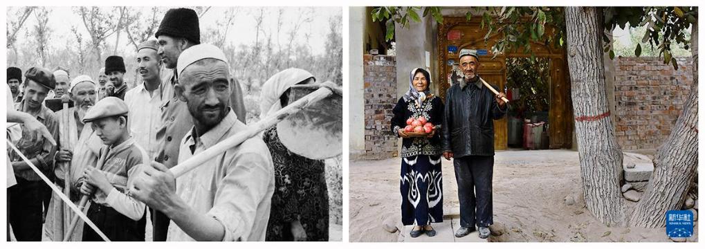 左图:1990年9月,策勒乡托帕村的农民艾尼巴尔汗(中)和乡亲们一起在风沙前沿参加防风治沙劳动,身后的农田和果林,是她们艰辛付出收获的成果;右图:2016年10月,艾尼巴尔汗(左四)和乡亲们在林地前合影。