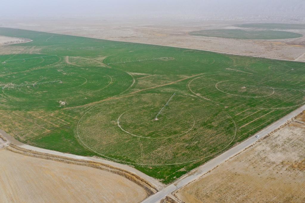 在新疆阿克苏地区拜城县塔里木河干流生态综合治理项目区拍摄的万亩人工草场(2025年4月12日摄)。新华社记者 丁磊 摄