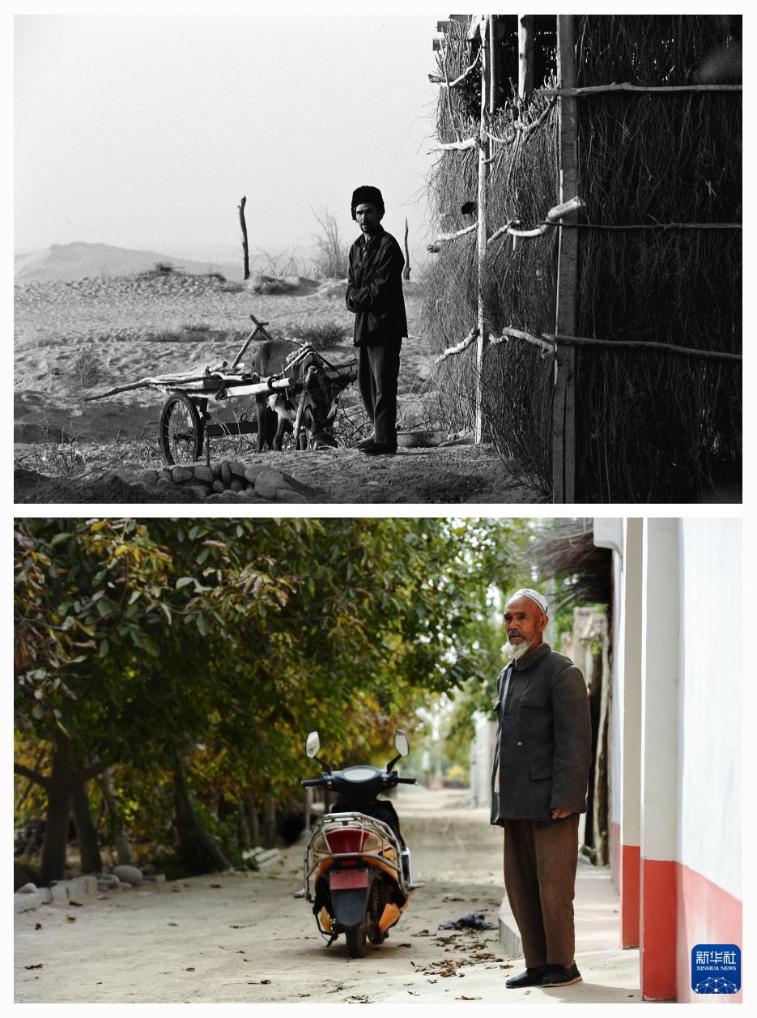 左图:2005年8月,准备改造庭院的策勒乡托帕村农民吐尔逊·热介甫正在规划着在庭院内外多种些树。右图:2016年10月,78岁的吐尔逊(左二)和乡亲们坐在电动三轮车上,去乡里赶巴扎。乡村道路两边茂密的林木,挡住沙尘,投下凉荫。