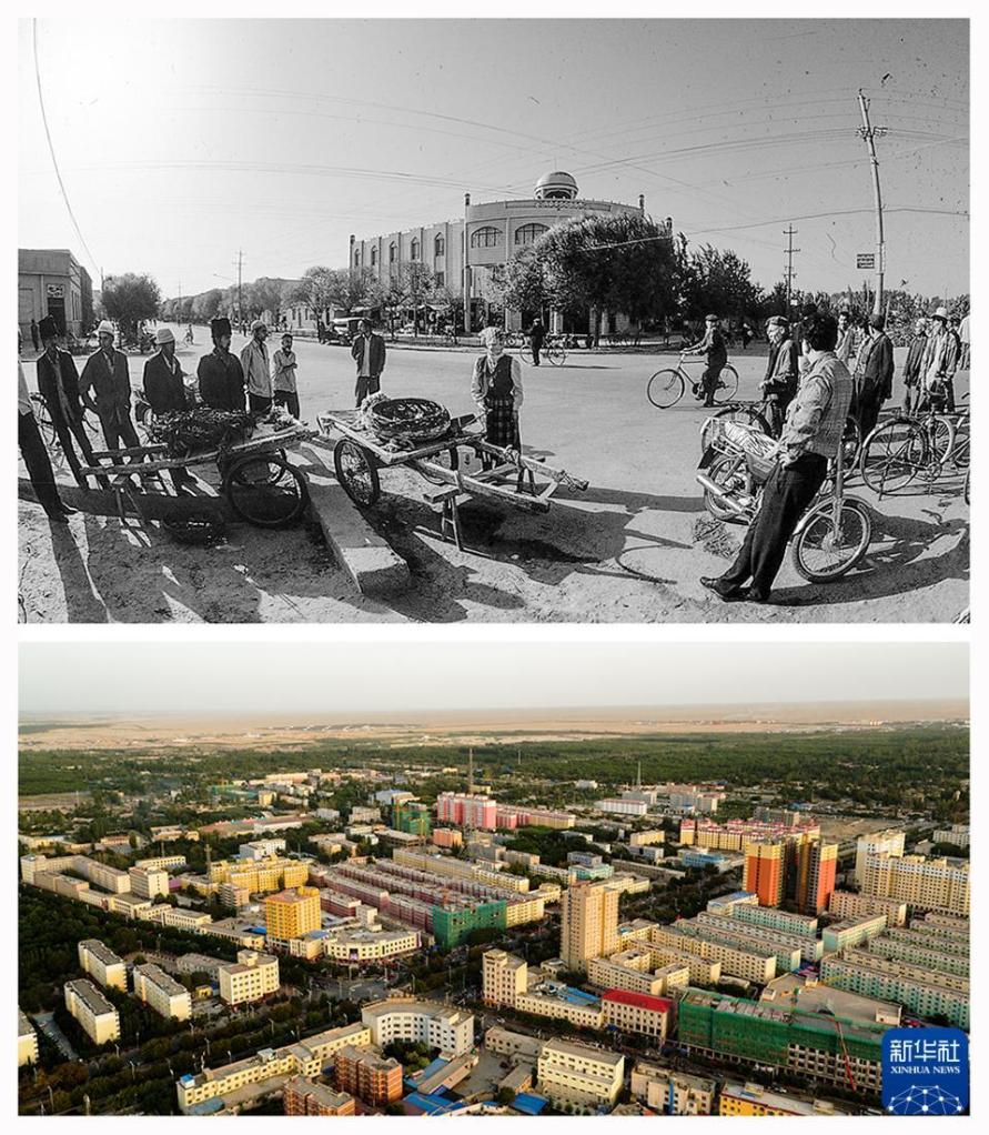 上图:1990年拍摄的策勒县城,下图:2016年拍摄的策勒县城。