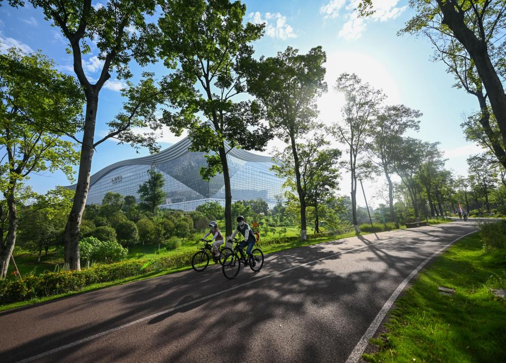 2023年7月16日,人们在成都高新区桂溪生态公园骑行。新华社记者 王曦 摄