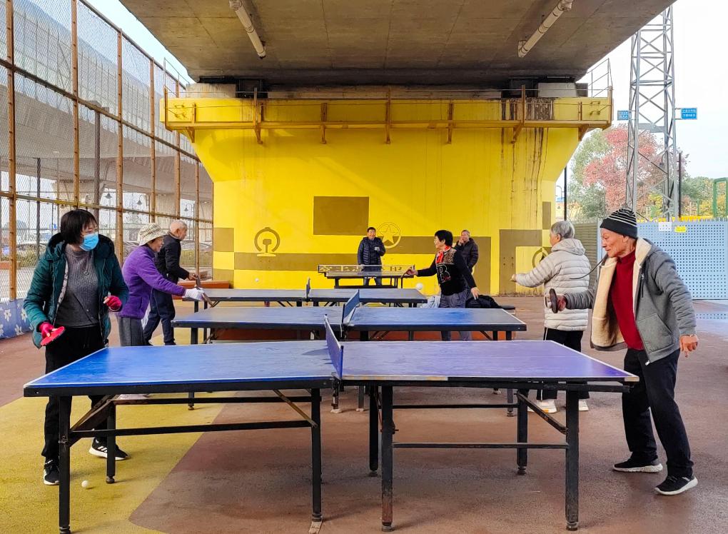 2023年12月5日,在宁波市鄞州区五乡镇,老年人在一处桥下运动场打乒乓球。新华社发(胡学军摄)