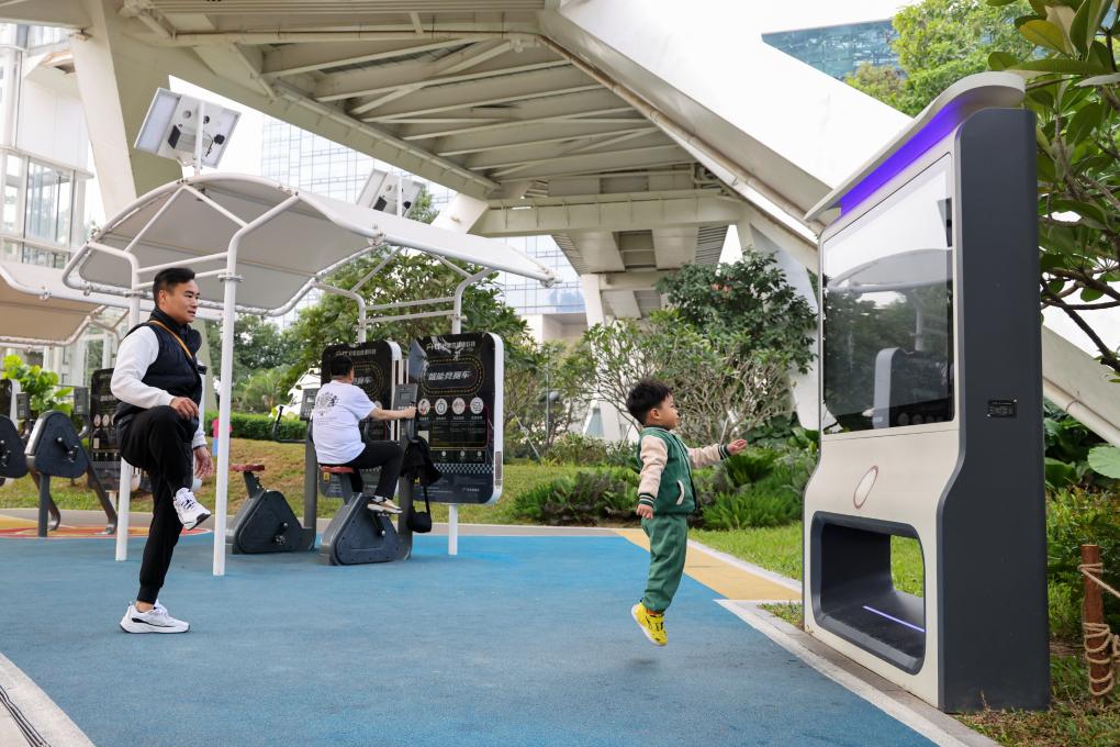2024年12月27日,在深圳笔架山公园,小朋友和家长一起使用智能互动屏锻炼身体。新华社记者 梁旭 摄