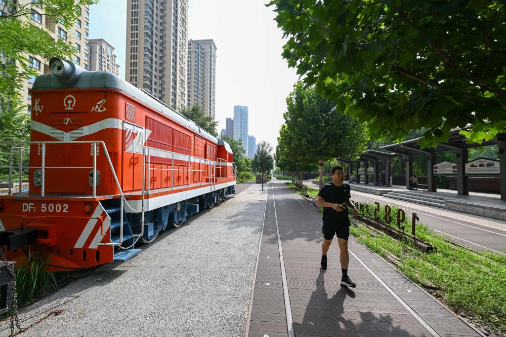 2024年8月8日,市民在天津市城市绿道公园步道上跑步。城市绿道公园原为已停用的津浦(陈塘支线)铁路,自2019年起分段提升改造,在保留了铁路元素的同时,增加植被绿化面积和公共体育设施,构建多功能运动健身场所,为市民提供一个开放式的运动主题生态廊道。 新华社记者 孙凡越 摄