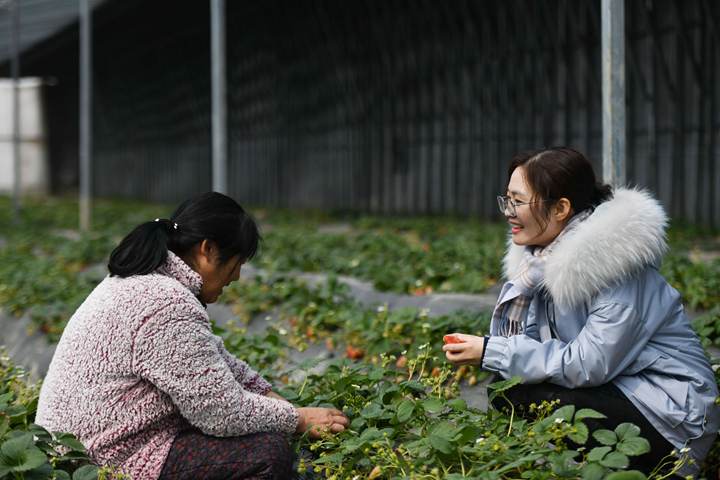 2月22日,在安徽省滁州市定遠縣吳圩鎮,王萌萌(右)與草莓種植戶交流。新華社記者 張端 攝
