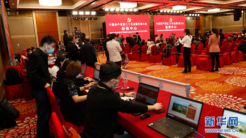 10月18日(星期二)19:30,二十大新聞中心將在梅地亞新聞中心二層新聞發(fā)布廳舉辦第二場(chǎng)集體采訪。圖為記者在現(xiàn)場(chǎng)工作。(新華網(wǎng) 陳杰 攝)