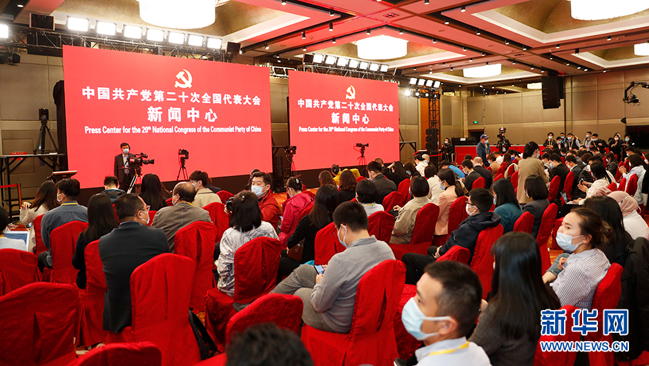 10月20日(星期四)19:30,二十大新聞中心將在梅地亞新聞中心二層新聞發布廳舉辦第五場集體采訪。圖為集體采訪前新世紀日航飯店三層世紀廳分會場。(新華網 陳杰 攝)