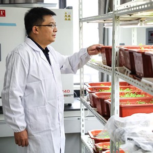 10月20日,貴州大學(xué)動(dòng)物科學(xué)學(xué)院院長(zhǎng)陳超在實(shí)驗(yàn)室內(nèi)觀察新品種牧草的生長(zhǎng)情況。新華社記者 歐東衢 攝