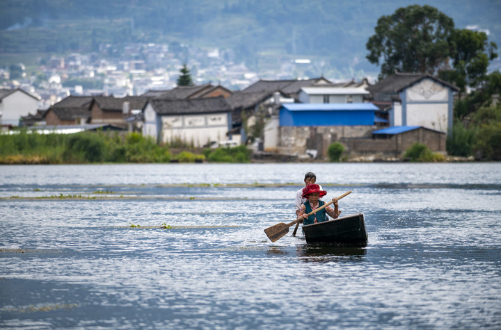 9月28日,洱源西湖當地村民劃船出行。新華社記者 陳欣波 攝