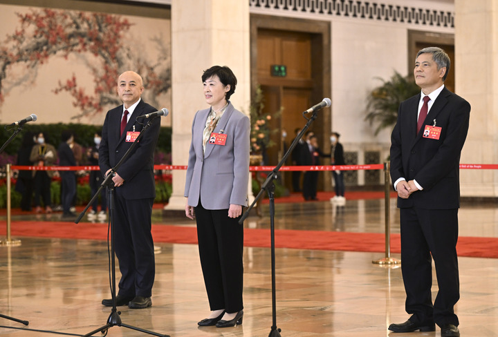 王旭東、錢素云、謝春濤代表(自左至右)在“黨代表通道”接受采訪。新華社記者 金良快 攝