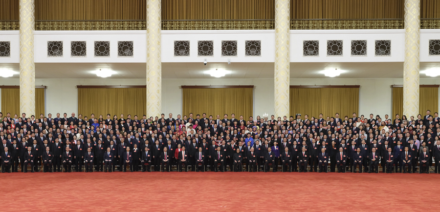 10月23日下午,中共中央總書記、國家主席、中央軍委主席習近平等領導同志在北京人民大會堂親切會見出席黨的二十大代表、特邀代表和列席人員,并同大家合影留念。新華社記者 丁林 攝