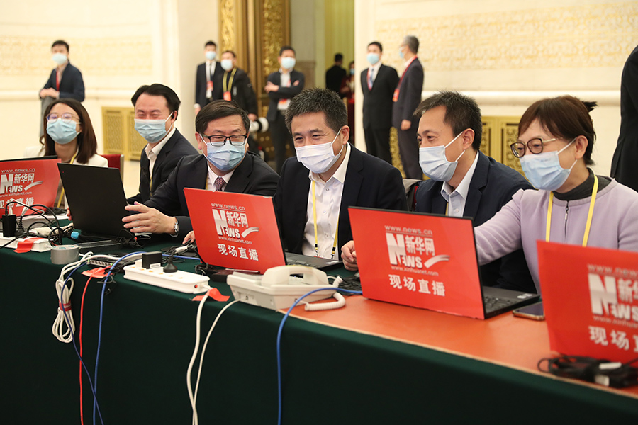 中國共產黨第二十屆中央委員會第一次全體會議新選出的中央政治局常委將于23日中午12時許,同采訪中共二十大的中外記者見面。圖為新華網記者在現場進行直播準備。(新華網 黃博陽 攝)