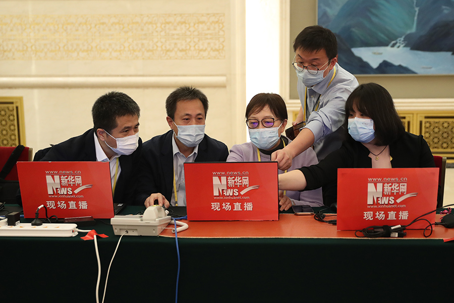 中國共產黨第二十屆中央委員會第一次全體會議新選出的中央政治局常委將于23日中午12時許,同采訪中共二十大的中外記者見面。圖為新華網記者在現場進行直播準備。(新華網 黃博陽 攝)