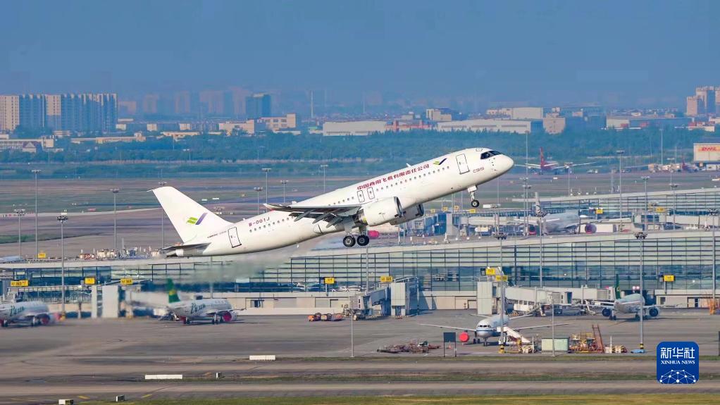 2022年5月14日6時52分,編號為B-001J的C919大飛機從上海浦東機場第4跑道起飛,于9時54分安全降落,標志著中國商飛公司即將交付首家用戶的首架C919大飛機首次飛行試驗圓滿完成。新華社發