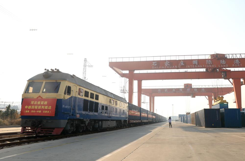 河北省首趟中越回程班列抵達石家莊國際陸港(2023年12月5日攝)。新華社發(梁子棟攝)