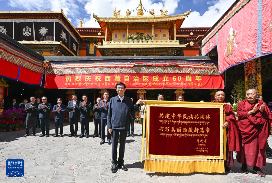 代表团到大昭寺看望慰问西藏宗教界爱国人士,赠送习近平总书记题词“共建中华民族共同体 书写美丽西藏新篇章”贺幛。王沪宁表示,藏传佛教具有爱国爱教、护国利民的优良传统,希望广大宗教界人士全面贯彻党的宗教工作基本方针,积极促进宗教和顺、社会和谐、民族和睦,坚决维护祖国统一和民族团结,引导信教群众坚定听党话、跟党走,投身社会主义现代化新西藏建设。